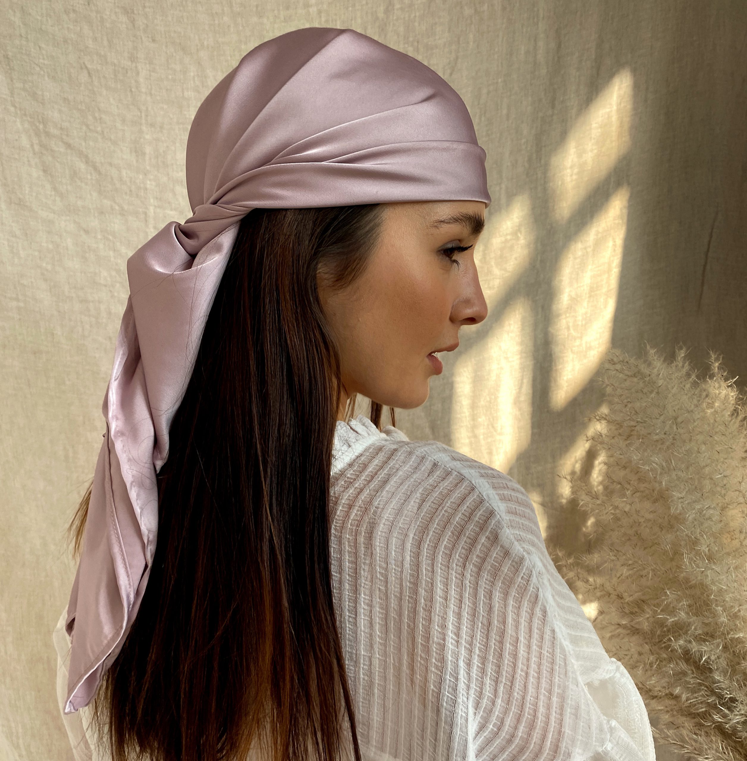 Jedwabna chusta na głowę, to modna inspiracja, która sprawdzi się w gorące dni. Chroni włosy od słońca a przy tym prezentuje się stylowo.